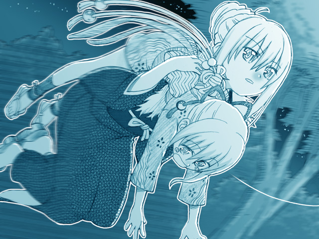 洞窟を飛び出た私は、届く匂いに鼻をひくつかせる。 “クソ………フザ………ル………! ………タスケ………………クッ………!!” 「………こっちかな……んん……こっち?」 意識を集中し、手がかりを捉えるために必死になる。 目も耳も閉じて匂いを拾おうとするが、あんまり意味は無いみたい。 遠くから聞こえている……というよりも、これはなんというか……。 『糸………電話?』 そう、糸電話。 ととさまが葉っぱと糸を使って作ってくれた、アレに近い。 微細な振動が何かを伝わって直接聞こえているような、そんな感覚。 鼻に触れてみる。 糸―――を意識したとたんに、かすかに感じる手ごたえ。 繋がっている。私の体に何か………ピリピリする糸の様なものが繋がっている。 『どっち………? 北東………境界地?』 強く強く意識すると、闇夜の中でも存在を主張する赤い糸が。 北東の森に向かって、道を真っ直ぐ伸びているのが見える。 「かかさまっ、“糸”が!」 「善し!」 かかさまは右腕で私を肩に担ぎ上げると、私の視線を辿って走り出す。 「たいしたものです響! えらい!」 「ふええ、なにがですかぁ!?」 「帰ったらたくさん褒めてあげます!」 風の無い夜なのに、ごうごうと空気の音が聞こえるぐらい凄まじい速さで駆けるかかさま。 夜の風がびしばしと当たって、なんだか猛烈に寒いです! そうして、ぐんぐんと近づいてくる緑の………ううん、黒い天井。 夜の神奈備はまるで、森というよりも一匹の巨大な怪物みたい。 「か、かかさまぁ! 私、境界地にはいってもいいのですか!?」 「臆しましたか!」 「そそそそ、そんな滅相もありません! 響はかかさまのお怒りの方がよほど怖いです!」 「いい度胸ですね」 「い、いやいやいや! 比較の問題ですよぉ!」 そうして近づく森の入り口。よく見ると入り口なんか何処にもありません。 というか、どう見ても壁にしか見えませんよ!? 「か、かかさま! 入る隙間なんてどこにもないですよ!?」 「響は繊細ですね」 「そういう問題ですかー!?」 森というか壁と化している入り口へ、風の様な速さで突っ込んでいくかかさま! 「ひゃああああ!」 「“罪と言う罪は在らじと 祓え給え清め給う―――”」 かかさまが何事かを呟くと同時に、がばっと口を開ける神奈備の森。 その様はもう、何の比喩もなく単なる怪物のお口であり。 「ぎゃああああああああ!! たべられちゃううううう!!」 あまりの怖さに、ちょっとおしっこちびってしまいました………。 ズゴオオンッ!!! 猛烈な衝撃を発し、背後で何かが閉じる音。 周囲は完全な闇。一切合財なんにも見えません。 「か…………かかさまあああああ! どこですかぁぁぁぁぁ!」 「あなたを抱えているでしょうに。ほら、よしよし」 「かかさまあああああ! ぴぎゃあああああ!」 何にも見えないので、かかさまの首にすがり付いてすんすんと匂いをかぐ。 もう、これでもかっていうくらい優しい匂いが私を包んで、爆発しそうだった心臓が落ち着きを取り戻す。 「さて、少しは落ち着きましたか?」 「はうううう、はううううう………ぷきゅううぅ………」 「完全にうりぼうに戻っていますね、もう。 私達は夜目は効きませんが、敏感な鼻があるのですから、それを使いなさい」 「は、鼻ですか?」 すんすん。う、ちょっとおしっこの事思い出してへこむ。 意識を集中して、くんくんと周囲の匂いをかぐと、ちょっとずつ辺りの風景が頭に浮かんできた。 わ、何これ!? 「なななななな? 見えないけど見えますよ!?」 「え………もう体得したのですか!」 「なんですかこれわ!?」 「私たちに備わった“神通”です」 「神通……」 才能……の事だったかな。 私たち、という事はかかさまにも出来るのかな。 「興味深いですが、後にしましょう。 響、まだ匂いますか? 視えていますか?」 「はい………んん、さっきより………感じにくいですがなんとか。 んん……匂いが減ったような………」 赤い糸に感覚を集中させる。 きな臭さは感じるけど、感情は薄くしか捉えられず、血の匂いばかり。 「………拙いですね。 しかし……何処かの遊行神? それにしては何故神奈備を通って……」 「かかさま?」 「いえ、とにかくその場まで急ぎましょう。 方向を示せますか?」 「は、はい。お尻の向き変えますね。んしょ」 かかさまの肩の上でもぞもぞと動いて方向転換。 「さて行きましょう! 急ぎませんと!」 「うふふ。早く帰って、響のおしめも代えねばなりませんからね」 「か、かかさまーーーーー!?」 「くすくす」 そうして、深い闇の中を走り出すかかさま。 さあ、急がなくっちゃ! コイムスビ-神様と一緒- 響その12。 神通。神に通ずる力。 神通が示したのは夜の神奈備。幼き護法はその場所を目指しひた駆ける。 |