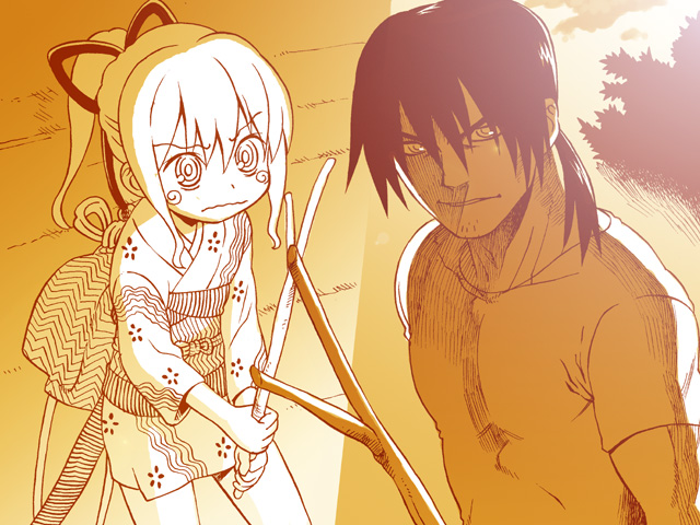 | ひょこひょこと歩いていく黒髪の人。 私はとぼとぼとその後をついていく。 やること無いという言葉はその通りで、私には断る理由が無かった。 「おー、凄まじい眺めだな………どんだけ高いんだよ、この山」 山頂の山頂、そこに広がる平地の端で、黒髪の人は薄靄がかかる山稜を見下ろしている。 オレンジ色の光が山々を照らし出し、赤一色に染まった世界はシンプルで、とっても綺麗で……。 私とは、対照的に見えた。 「おう、おちび。お前体術やるだろ?」 「やや? は、はい格闘を少々………」 「剣は?」 「いえ、みたこともないです」 「ふむ、無手だとビリビリが嫌だしな……」 質問の後、黒髪の人は近くに落ちていた枝を二本取り、一本を私へと放る。 慌てて受け取る私に、黒髪の人は近づいてくると。 べちっ! その枝で、私の頭を叩いた。 「あっ………いったあああああああああい!」 「かかか、油断大敵」 「なな、なにするんですかー!」 「ほれっ」 慌てて抗議する私の頭にもう一発。 痛い、すんごい痛い! 「タンコブだらけになっちまうなー、ほれっ」 「いたっ、いたたたた! や、やめてくださいー!」 「残念な事に俺の趣味は苛めでね。 ほれほれっ」 「いたっ、いたた! さ、最悪です! 最悪の趣味です!」 ニヤニヤと笑いながらぽこぽこと私の頭を叩く。 もうそれが凄く痛い。黒髪の人が持っている枝は細いのに、倍ぐらいはある棒で殴られてるみたい。 「悔しかったらそれで一本入れてみるんだな。そしたらやめてやるよ」 ぽこぽこと叩きながら、そんな事を言った。 「うー………やっ!」 「うおっ?」 地面を蹴って黒髪の人との間合いを取る。 ひとっとびで三間。振り向いて相対した私の目に、目を丸くした黒髪の人の顔が映る。 やな人だやな人だ! 一方的な暴力はいけないって習わなかったのか、うー! それに、私は山神の子。立派で偉大なととさまの子なんだ。 やられ放題なんて、こけんに関わる! 「一本……約束しましたからねっ!」 「あ………ああ。 いいぜ、約束は破らない主義だ」 ニヤリとほくそえむと、杖を持っていないほうの手ですいっと枝を構える。 「………う」 それだけ。 たったそれだけなのに、もう全然勝てる気がしなくなった。 「え………」 怪我人なのに、無造作に構えてるだけなのに。 黒髪の人から伺える気配は、組手してる時のととさま以上の重圧で。 飛び込む隙が、何処にも見あたらない。 「どうしたよおちびちゃん。びびったか?」 「うう………」 「うごかねえんならこっちから行くぞ」 バシンッ!! 「いっ………たああああああああ!?」 脳天に一本。 気付いた時には黒髪の人が目前にいて、枝切れを頭に叩き込まれていた。 「そらそらそらー」 「いたっ、いたたたたた! いたいですよー!」 「悔しかったら反撃してみろー」 ニヤニヤと笑いながら連打を打ち込んでくる。 動き自体は緩やかで、そんなに素早くは無いはずなのに、頭に受ける衝撃は間断なく続く。 「うやっ!」 頭の上で枝を振り回して防御する。頭の形が変わっちゃう! だけど、今度は後ろ頭に衝撃! 「いたーーーーーーい!!」 「うはは、これは打ちごろの案山子さんですなー」 振り返ると、黒髪の人は私の後ろでニヤニヤしていた。 ぜ、全然目で追えない。とてもじゃないけど怪我人の動きじゃない。 「う、ううう………怪我してるの嘘ですねっ!」 「そう見えるか?」 「う………」 良く見るとニヤニヤ笑いの頬には脂汗が見えるし、足だって引きずってる。 杖を突いた腕は少し震えてるし、良く見ると重心だってフラフラしていた。 「うううう〜………」 こ、こんな怪我人に手も足も出ないなんて。 あまりの無力に項垂れてしまう。 バシインッ! 「うきゃっ!!」 「そら、顔下げんな。こっちの攻撃は続くぜ?」 「ううううううううう!!」 言い様の無いモヤモヤがお腹の中に溢れて、爆発しそうだった。 こんな理不尽、こんな酷い人! 放っておいてどっか行っちゃえば良い。 相手にする必要なんてないんだから! でも………。 「うやあああああああああああ!!!」 でも! 理性より理屈より、悔しくって悔しくて、その想いが一番で。 奥歯をいっぱい噛み締める。 考えて考えて出した結論より、目の前の理不尽に負ける事のほうがずっと嫌だった! 「うやー!」 「おっ」 思いっきり地を蹴って黒髪の人のいるところに突っ込む。 理も、策も、なんにも無い突進。 でも、黒髪の人は少し慌てた様子で私の体を回避した。 「猪戦法だな、おちびちゃん」 「うっさいうっさいっ! しゃがらしかー!」 「かかか、調子出てきたじゃねえか!」 もう考えるのはやめ!! 一本取れば良い、それはようするに捕まえちゃえばいいって事! そしたら一本でも百本でも入れ放題なんだから!! 「たやーーーー!!」 全身のばねを使って真っ直ぐに突進する。 私の突進先に黒髪の人はいないが、そんなの関係ない。 着地と同時に、黒髪の人が居る―――と“感じた”ほうに再突進をかける! 「おわっ!」 それをかわす黒髪の人。 回避