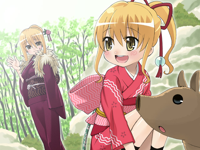 ちゅんちゅん………ちゅん。 「ん………にゅ……。 ………ふわ?」 洞窟に差し込む柔らかい光に瞼を瞬かせる。 聞こえるのは、のどかに歌う鳥の声と、穏やかな寝息。 目を開けば、そこには大好きなかかさまのおっぱい。 「……あ、朝だ……」 眠い目を擦り、ふかふか藁の中から這い出す。 身体についた藁を弾き飛ばすように、ふるふると身体を震わせると、気合一発、両頬を張る。 「つあーーっ! 目がさめたー!」 寝起きから5秒で完全覚醒に至った意識は、一気にフルスロットルへ。 さあ急がなくては! 「かかさまーーーー! 朝ですよーーー!」 「あむ……んんん……」 「起きなきゃ駄目ですよーーー!」 嫌々をするように藁に顔を埋めるかかさま。 なんというねぼすけさん! 焦る私は、その肩を激しく揺する。 「……んん……響ですか? なんですか……まだ早いですよ……?」 「駄目です! かかさま、お忘れですか!」 「何がです……もう」 もう少し寝かせてと言わんばかりに顔を隠すかかさま。 その様子に頬を膨らませると、私は口元に悪戯っぽい笑みを浮かべ、かかさまのおっぱいを鷲掴みにする。 「とやーーー!」 「あやっ! あやややや!?」 「もいじゃいますよーーー!」 「も、もう! なんなのですか響!」 「なんなのではありません! 今日からかかさまが、山神様なのですよーーーー!」 気合一発、叫ぶ私。 そう、今日からしばらくは、私達にとって特別な日々。 父様の居ない……母様と二人きりの日々なのです。 ―――神無月。またの名を神在月。 一年に一度、遥か西国出雲にて、神様が集って会議をする“神議り”が開かれる時節の事。 その間、各神域において代表を務める護法や神格は、全て出雲へと赴くので、神域の管理は従属神や夫婦神が勤める事になる。 つまりは、私やかかさまの事だ。 「そんな事は判っています……もう」 「あうー……」 頭のたんこぶがとっても痛い。 問答無用で拳骨を貰った私は、頬を膨らませたかかさまの前で正座をさせられていた。 「やる事自体に変わりは無いのですから、いつも通りでいれば良いのです」 「とは言われましても、響にとっては初めてですゆえ……」 「なればなおさら胸を掴んで起こすなどと、はしたない真似はお止しなさい!」 「う、うう……かかさまのおっぱいが悪いのです……」 「………ほう」 「わわわ、嘘です! 反省しております!」 ゆらりと立ち上る怒気に気圧され、一目散に洞窟の外へ逃げ出す。 かかさまは冗談が通じないのです、もう! 洞窟を出ると、外は素晴らしき秋晴れ。空気も清浄に澄み渡り、なんとも気持ちの良い朝です。 「ぷききー」 「ぷきーー!」 「あはっ、みんなおはようー!」 私の声を聞きつけたのか、近くの洞穴にすんでいる猪の兄弟が寄ってくる。 挨拶をするように体を寄せ合う私と猪たち。 「今日からしばらくととさまが居ないけど、私がお山の平和を守るから安心してて!」 「ぷきー」 「ぷききー」 「大丈夫かって? 普段から鍛えられてるんだから、大丈夫!」 満面の笑顔と力強い言質に安心したのか、嬉しそうに頬を寄せてくる猪たち。 洞窟の外に出てきたかかさまは私達を見て優しく微笑む。 「それでは響、森の皆の事をお願いしますね」 「は。お出かけですかかかさま!」 「はい。 響もお役目、頑張るのですよ?」 「はい、それはもう!」 「ふふ、貴方は余り気負うと失敗しますから、根を詰めすぎないようにね」 着物の袖口で口元を隠し、ころころと上品に微笑むと、かかさまは悠々とした足取りで“境界”へと向かってゆく。 神域と、向こう側を繋ぐといわれる“境界地”へ―――。 「ぷきー?」 「うん? ははっ、ちょっと気になっただけ! さぁて、それじゃあ今日も元気に見回りに行こうか!」 コイムスビ-神様と一緒- 響その7。 父の居ない神無の月。 初めてのその時間を、幼い神は期待に胸躍らせて過ごす。 |