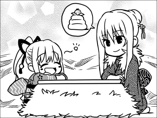 「年末ですね、かかさま!」 「そうですね、響」 「響ははじめてのおおみそかなので、とってもわくわくしています!」 「ふふ、年が明けるまで起きていなくてはいけないから、あまり張り切ると持ちませんよ」 「ふわ、て、徹夜ですか! 何故なのでしょーか!」 「年神様を迎えるためです」 「としがみさま?」 「稲魂を司る穀物の神です。年の初め、各々の家にやってきて、その年の豊作を呼び込むのです」 「ははぁ、お客様というわけですか! ではお迎えの準備をしなくては!」 「もう出来ていますよ」 「ふへ? しかし、お茶もおイモも、響とととさま、かかさまの分しかありませんよ?」 「うふふ、先程玄関にお餅を置いたでしょう?」 「あ、あのおいしそうなお餅は年神様の分だったのですか! し、知らずに食べてしまうところでした!」 「―――響?」 「ひっ! た、食べてませんよ! 響は良い子ですから!」 |