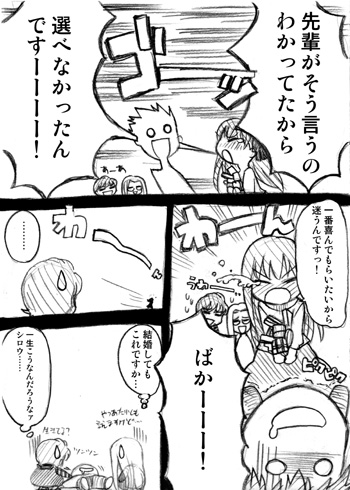 好きな人のでも何でも良いはやっぱ駄目だと思う。 がんばって作るから一番いいものあげたいんだって気持ち 無駄にしちゃうよなァ・・・このセリフ。 とか思った。 まあこの場合桜逆切れなわけですがw。 嫁になったので桜ちゃんちょっと前向きに元気ですよ。