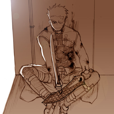 頭を莫耶、心臓を干将で。急所を守るように構えるアーチャー。