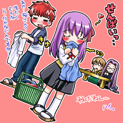 遠坂姉妹のラブラブダイアリー・桜編 今日は先輩と一緒にお洗濯をしました。 洗濯物乾しているとき 先輩の洋服から私の服と同じ 洗剤の香りがしてきて 「ああ、私は衛宮の家で暮らしているんだな」 と、思いました。 ずっとここで暮らしていけたらいいと思います。 ・・・先輩大好き。おやすみなさい。
